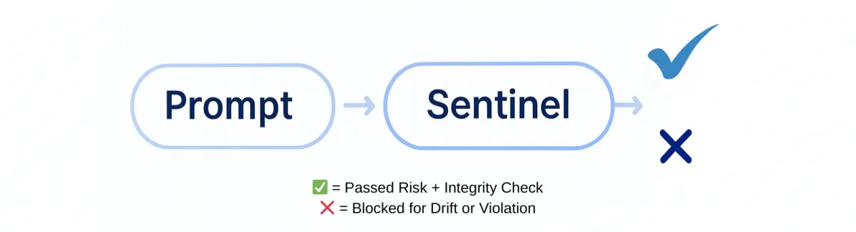 Sentinel™ wraps around any LLM and filters outputs through two layers: